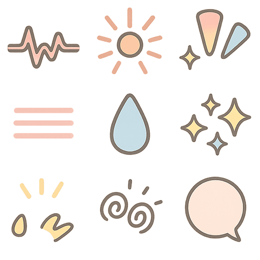 心拍線、太陽、水滴、キラキラ、吹き出し、感情線、光、渦巻き、汗マークなど。