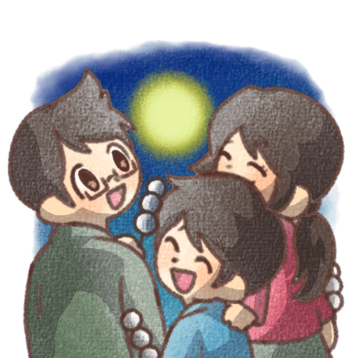 満月の夜、家族そろってお月見を楽しむやさしいワンシーン。