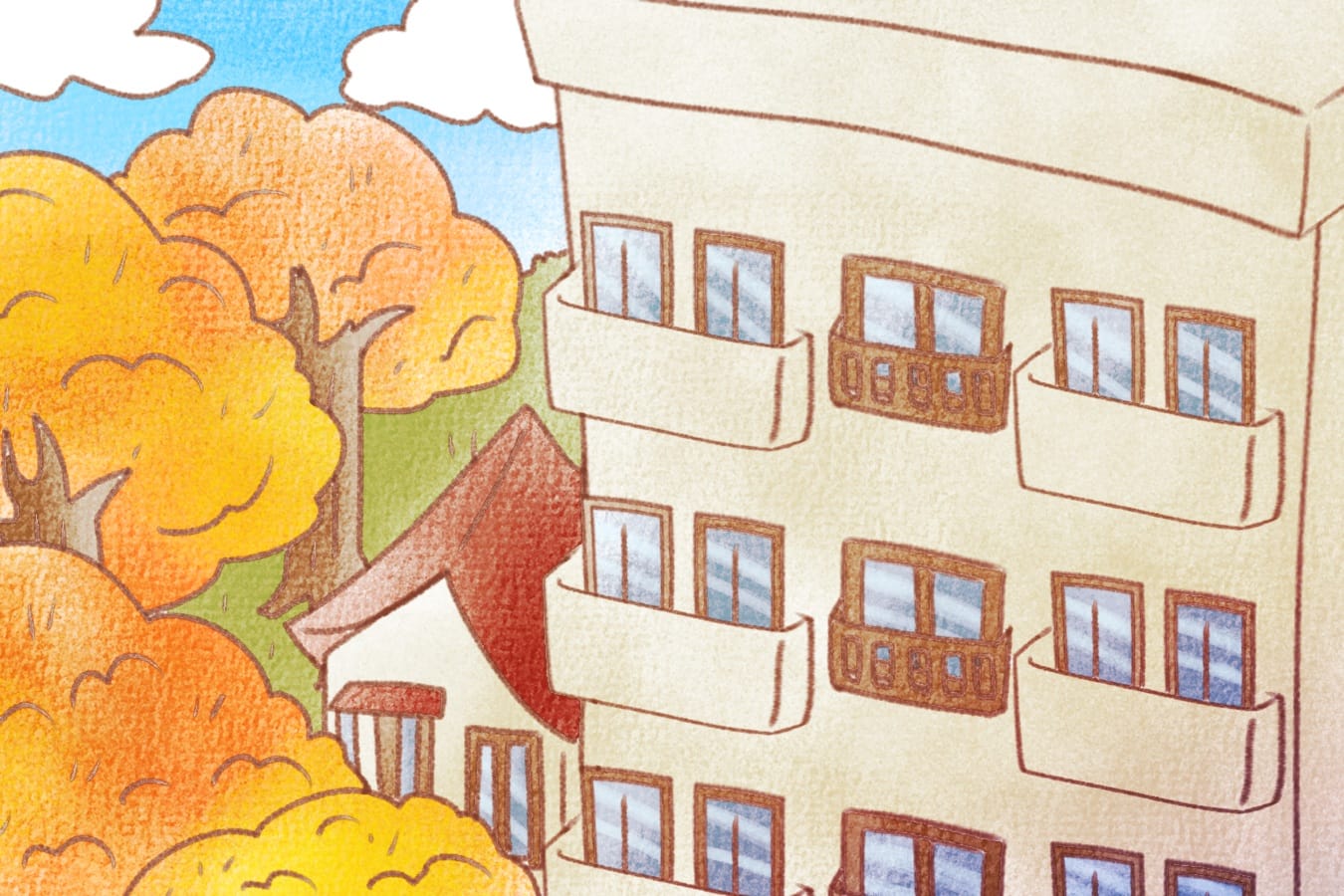 秋色に染まった木々と団地が並ぶ、ノスタルジックな風景イラスト🍂
