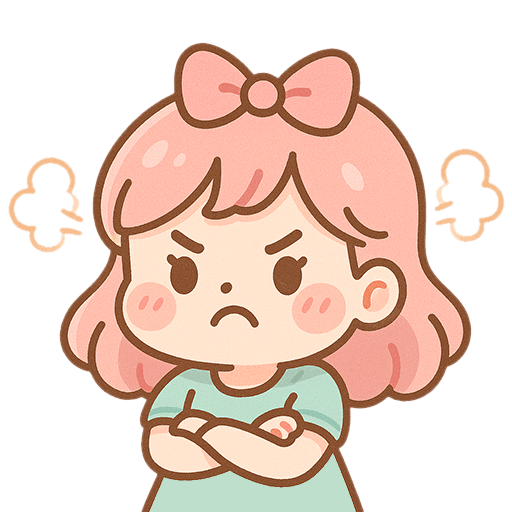 ぷくっとふくれたほっぺ、眉をひそめた顔、腕を組んだポーズに「ぷんぷん」マークの湯気もついて、感情が一目で伝わる表情がポイント♪