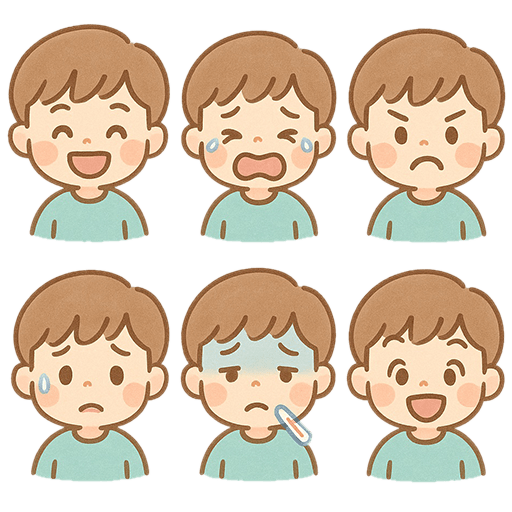 うれしい顔、泣き顔、怒り顔、不安顔、病気顔、にっこり笑顔─男の子のいろいろな感情を、やさしい手描き風タッチで表現した無料のアイコン素材セットです。
