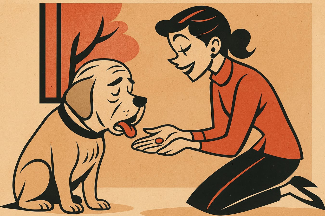 薬を手に老犬に差し出す女性のイラスト。舌を出した高齢犬と、優しい笑顔の女性がレトロ風タッチで描かれている。