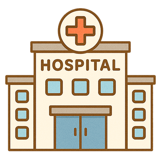 大きな赤十字マークと「HOSPITAL」の文字が印象的な、病院の外観を描いたシンプルでかわいいイラスト素材です。