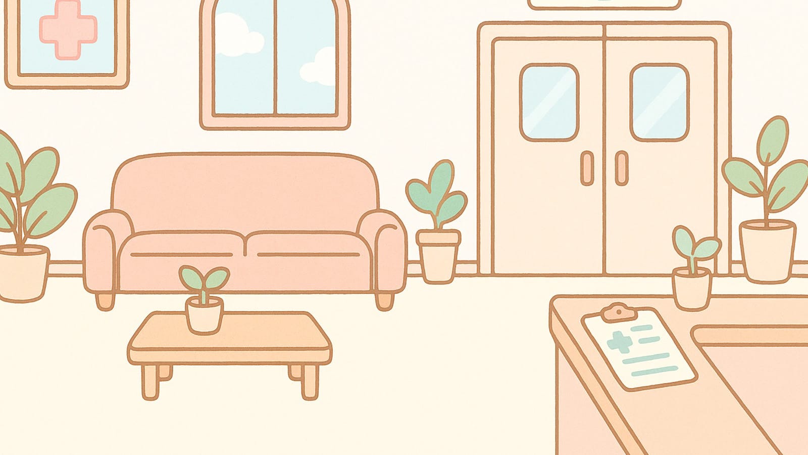 ソファや観葉植物、診察室のドア、問診票など、待合室ならではのアイテムが丁寧に描かれており、清潔感とやさしさが同居したデザイン。