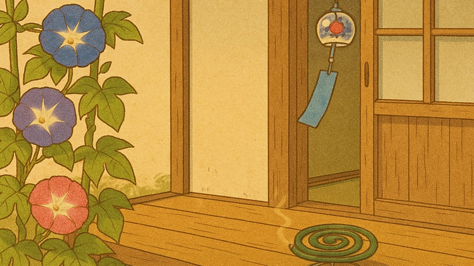 木造の縁側、涼しげなガラス風鈴、渦巻き型の蚊取り線香、そして咲き誇る朝顔。