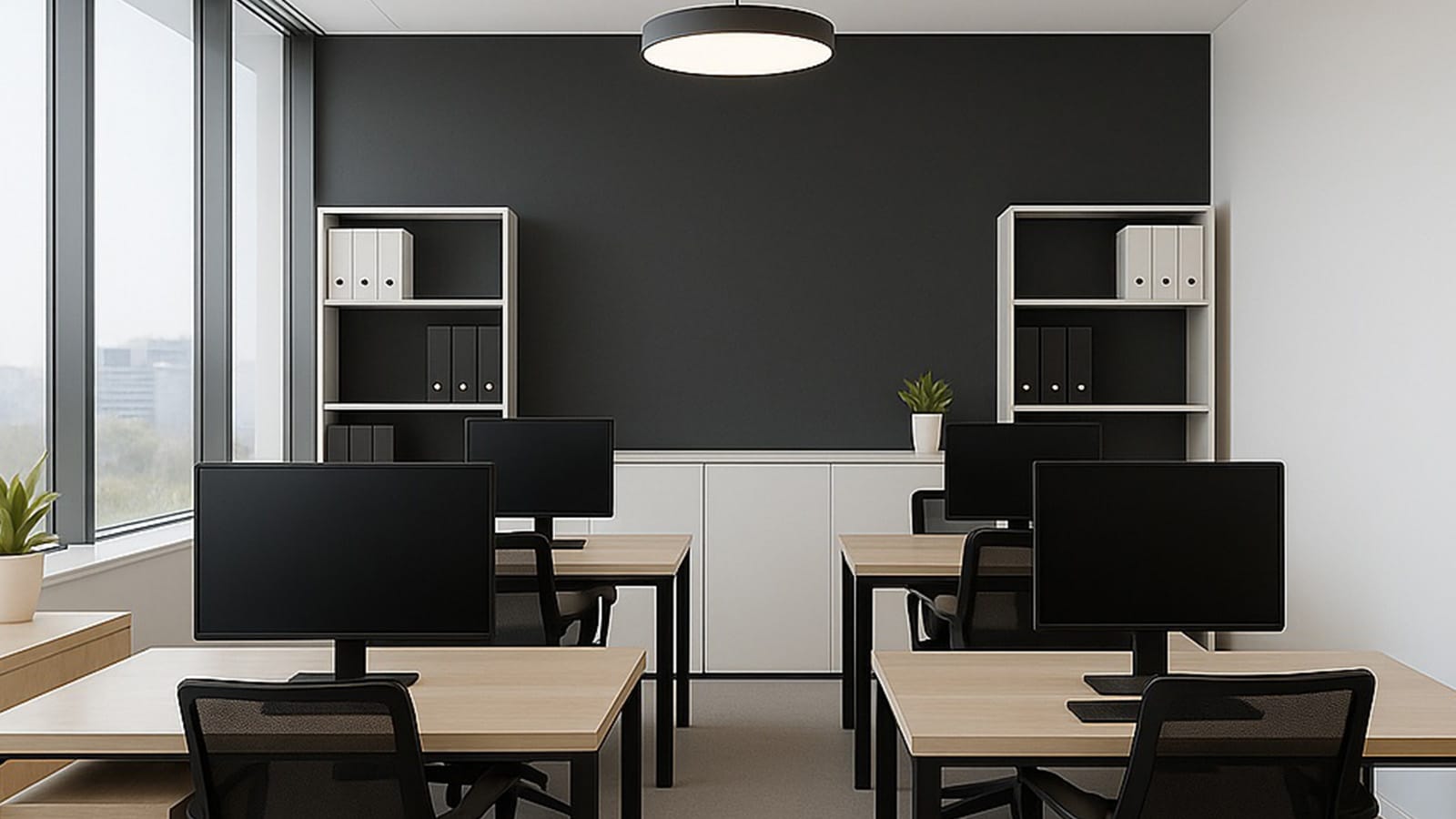 整然と並んだデスクとモニター、収納棚や観葉植物が配置されたクリーンな雰囲気が印象的。