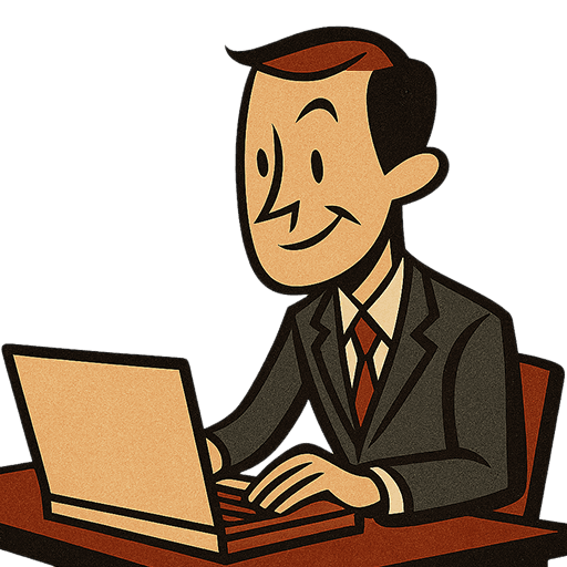 スーツ姿の男性がパソコンを操作する姿を、クラシックなレトロ風タッチで描いたイラストです。