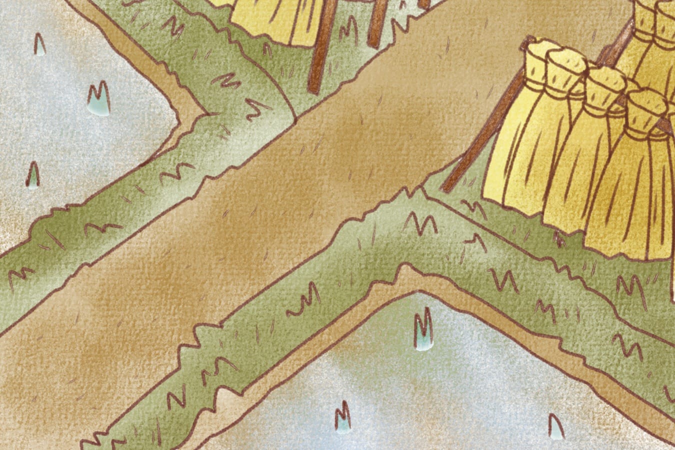 稲刈り後の田んぼと、並べられた稲束の農村風景イラスト。水の張られた田んぼに切り株が見え、土道が交差する構図。