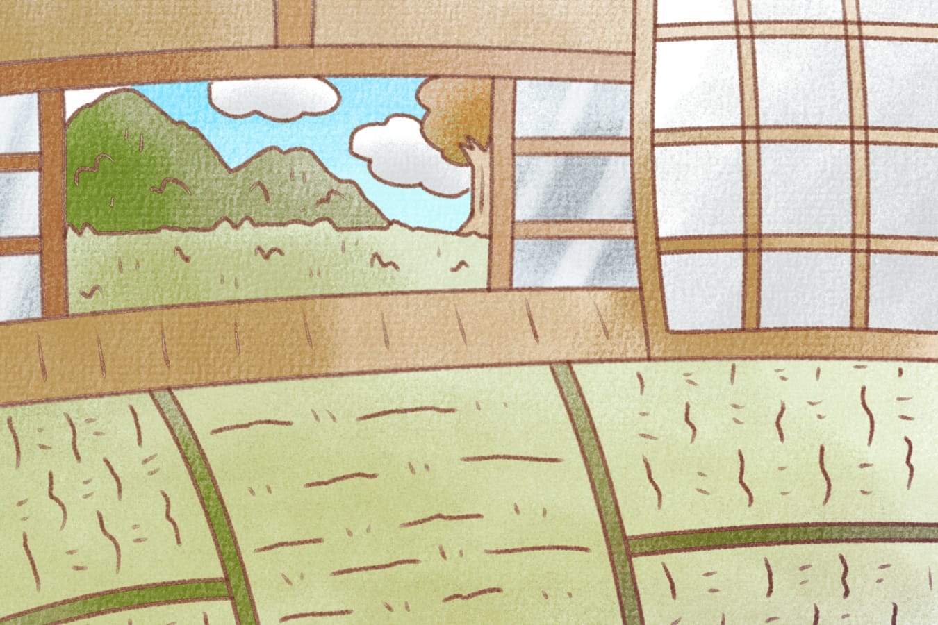 縁側と畳のある和風の室内から、山と草原の田舎風景を眺める高解像度イラスト。