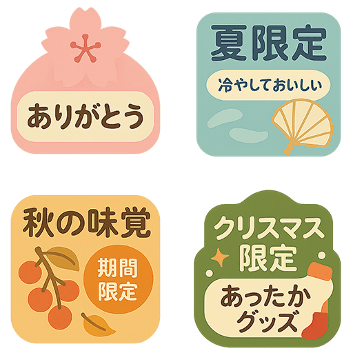 春の「ありがとう」、夏の「冷やしておいしい」、秋の「秋の味覚 期間限定」、冬の「クリスマス限定 あったかグッズ」など、季節に応じたフレーズ入りラベルがセットになった便利なイラスト素材です。