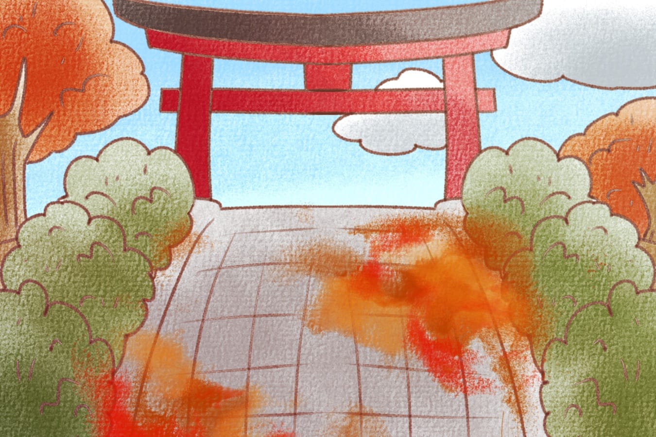 赤い鳥居と落ち葉舞う参道を描いた、秋らしい背景素材です。