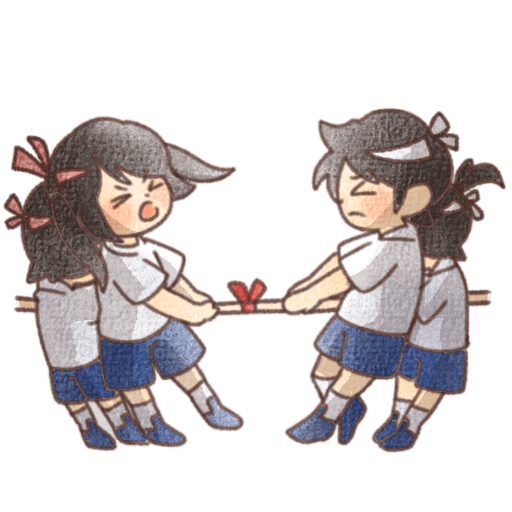 運動会で綱引きをする子どもたちのイラスト素材。赤白帽をかぶり、左右に分かれてロープを力強く引き合う様子。