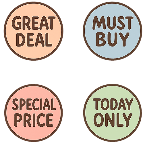 「GREAT DEAL」「MUST BUY」など、セールや限定感を伝える英語ラベル風アイコン🎯