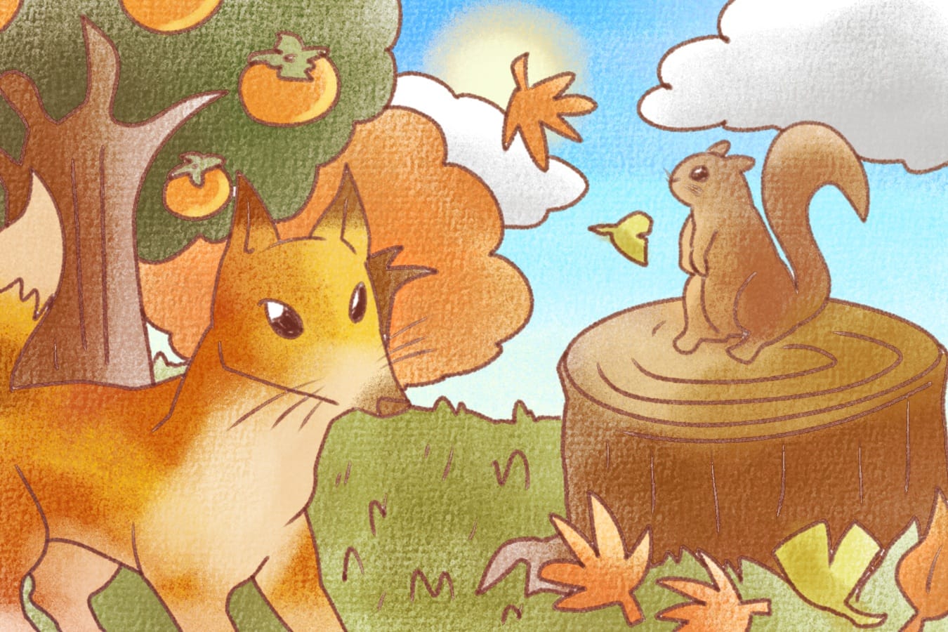 秋の森で出会うキツネとリス。落ち葉が舞い、柿の木が実るあたたかな自然風景🍁